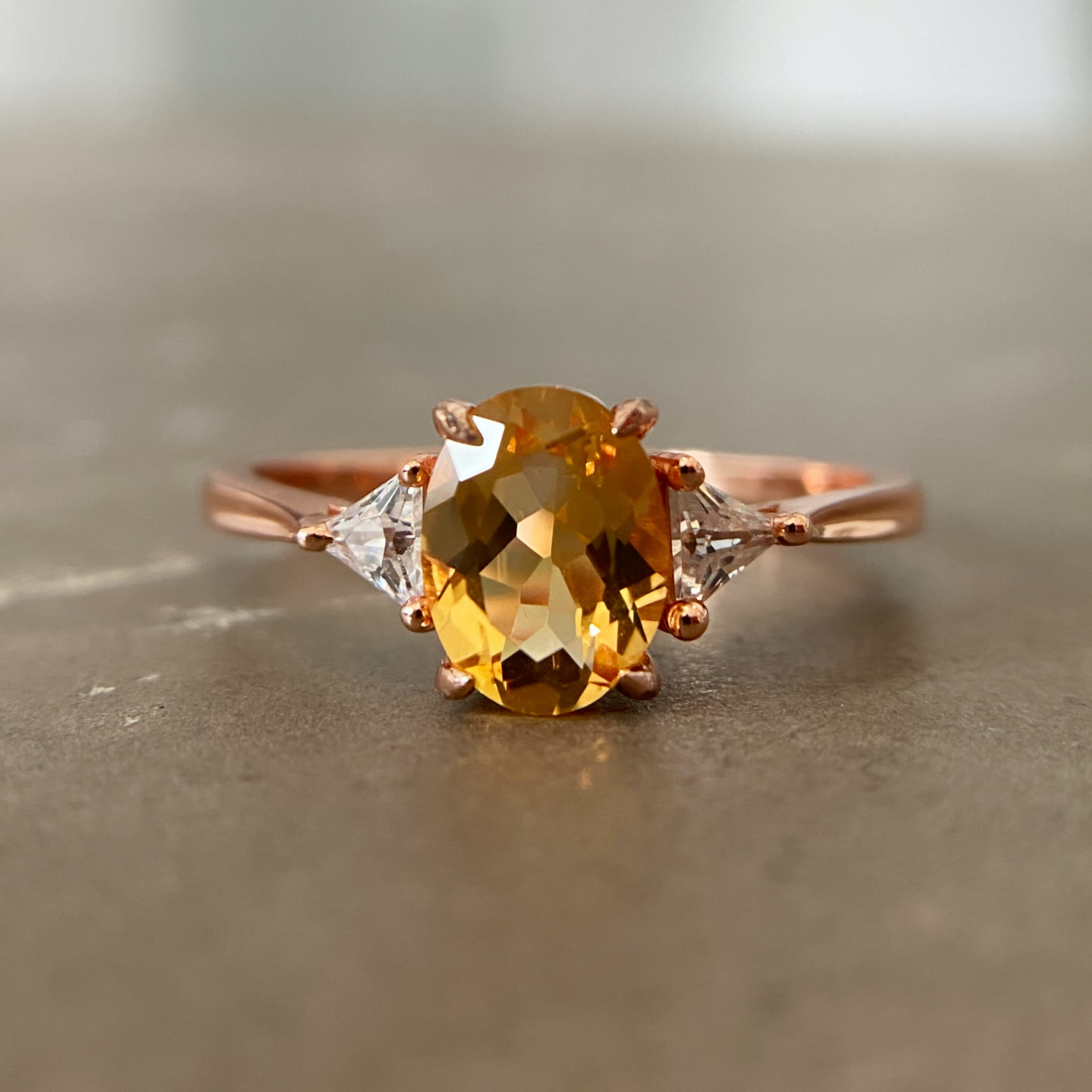 - The 7.0 x 5.0mm oval-shaped golden-yellow citrine shines in a quatrefoil frame of diamonds.